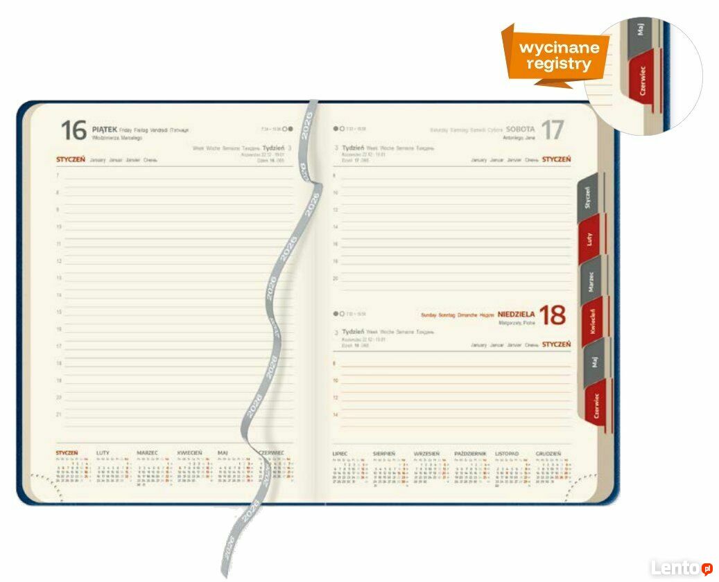 terminarz B5 z registrami na 2026 rokkalendarz B5 z kremowym papierem w ekoskórze