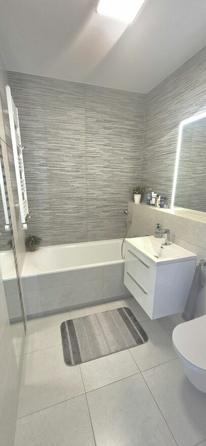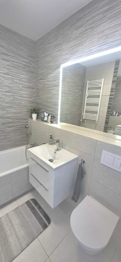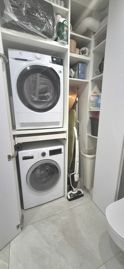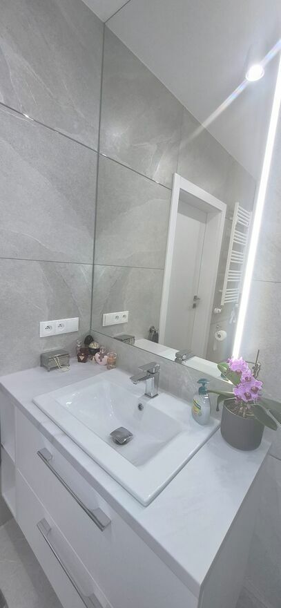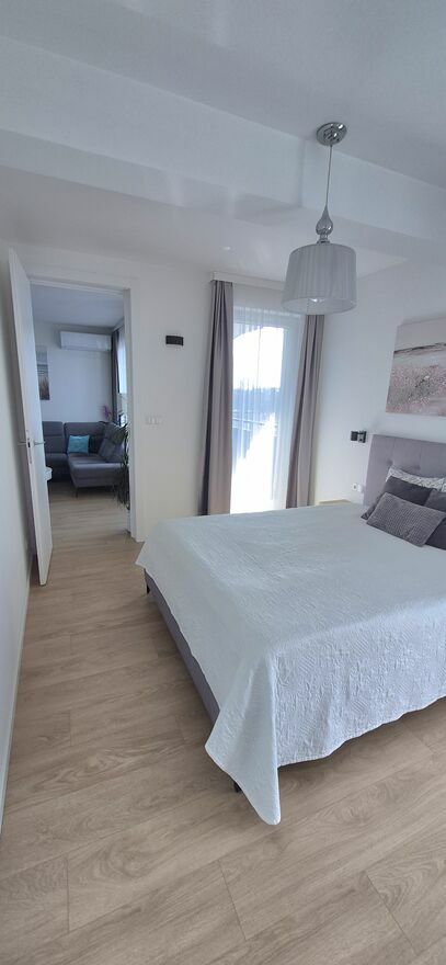 Meble na wymiar, wysokiej klasy panele, hiszpańskie kafelki, parapety z marmuru. Dobrej jakości sprzęt AGD, wideodomofon, klimatyzacja.