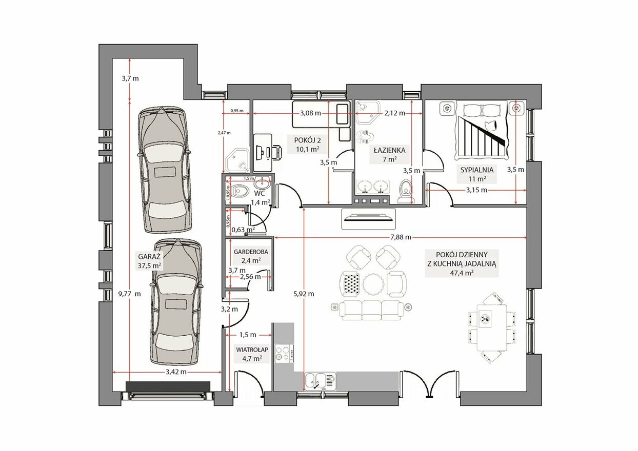 - pokój dzienny z kuchnią i jadalnią- 47,4 m2