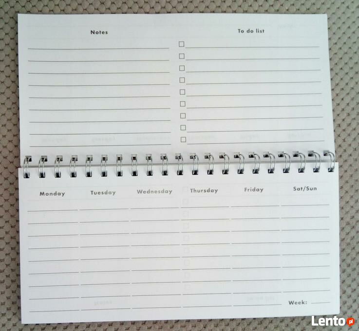 - posiada 104 kartki z podziałem na dni tygodnia i miejscem na notatki