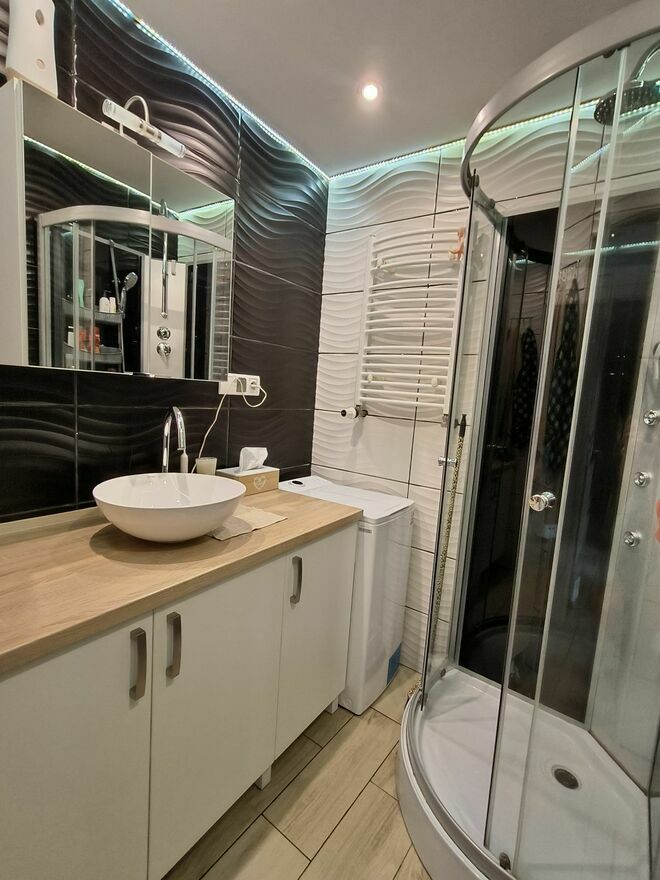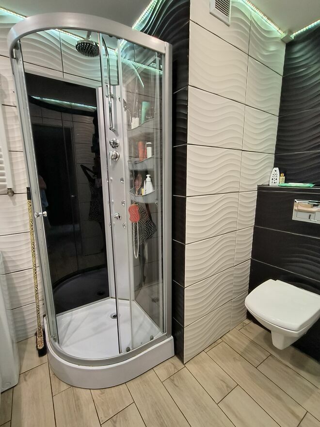 W łazience kabina prysznicowa z hydromasażem (sierpień 2024) oraz pralka ładowana od góry (lipiec 2025).
